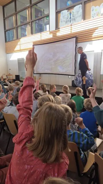 Ook directielid Joost Carpay van het NSO kreeg meer dan twintig vragen op zich afgevuurd van de groepen vijf en zes van basisschool De Klaverweide in Noordwijk. In de aula van de school hingen ruim honderd leerlingen aan zijn lippen, toen hij vertelde over de allereerste lancering van de Ariane 6 raket, die hij met eigen ogen heeft gezien. Verrast waren ze, toen ze ontdekten dat ook Buienrader en het Jeugdjournaal volop gebruikmaken van satellieten in de ruimte.