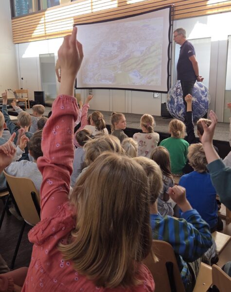 Twaalf vingers gaan hoog de lucht in. Nieuwsgierige blikken, de leerlingen zitten op het puntje van hun stoel. Wat is het belangrijkste onderdeel van een satelliet, willen ze weten. Kun je bosbranden zien vanuit de ruimte? En hoeveel satellieten draaien eigenlijk rond onze aarde?